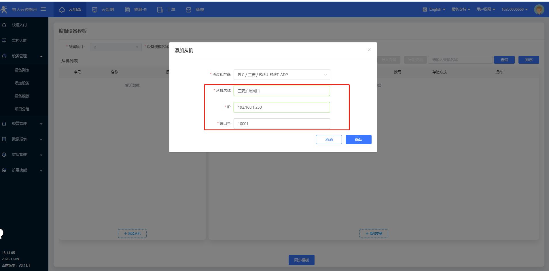 2.添加設(shè)備模板,選擇modbus/PLC》三菱》FX3U-ENET-ADP 模塊