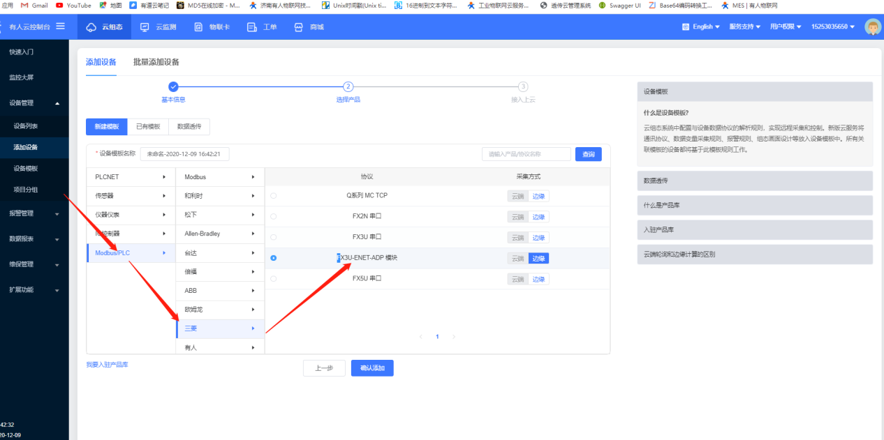2.添加設(shè)備模板,選擇modbus/PLC》三菱》FX3U-ENET-ADP 模塊