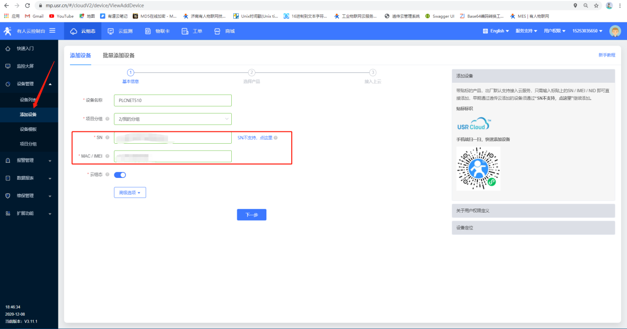 2.添加設備,使用PLCNET510背面標簽的MAC和SN添加,點擊下一步