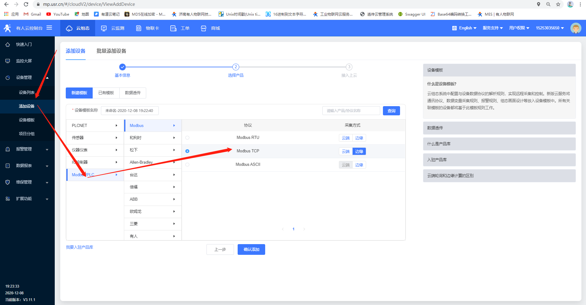 3.添加設備模板,選擇modbus/PLC》modbus》modbusTCP