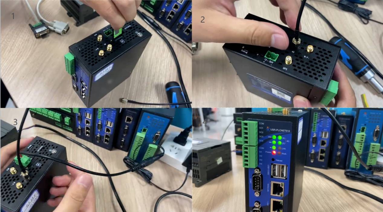 l PLCNET510插入SIM卡、連接天線,設(shè)備上電——駐網(wǎng)成功(2/3G信號(hào)燈和信號(hào)強(qiáng)度燈常亮,work燈閃爍)