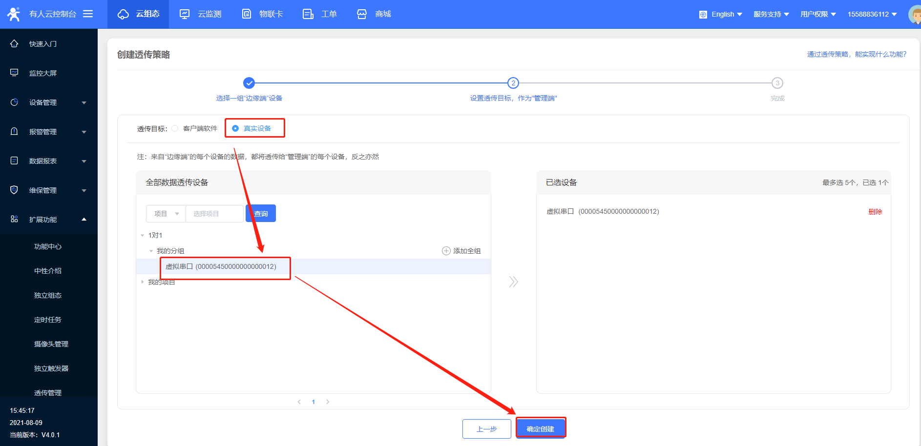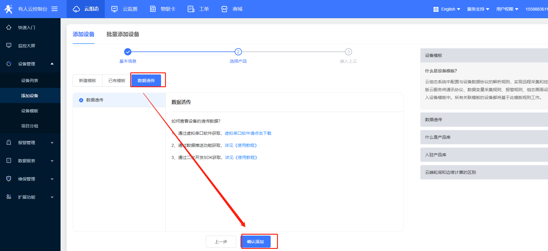 4>再添加一個(gè)設(shè)備,用于虛擬串口軟件,選擇數(shù)據(jù)透傳,添加成功后可以在設(shè)備列表中看到