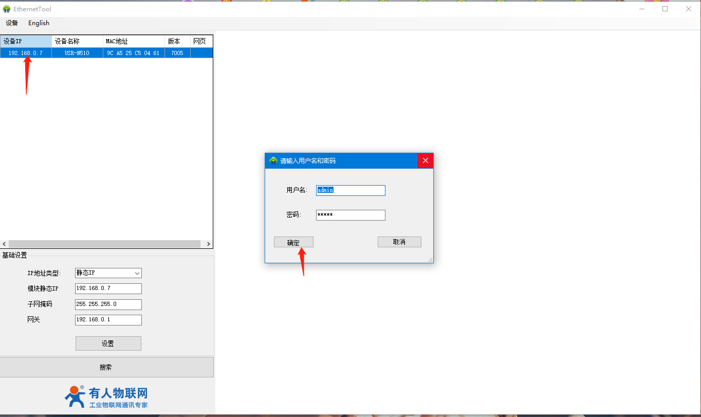 4、打開(kāi)510(H7)系列設(shè)置軟件,點(diǎn)擊搜索設(shè)備,可以搜索到510,并且可以看到目前510的相關(guān)信息,IP為192.168.0.7(默認(rèn)),設(shè)備名稱為:USR-N510,MAC地址為:9C A5 25 XX XX XX,版本為:7005。