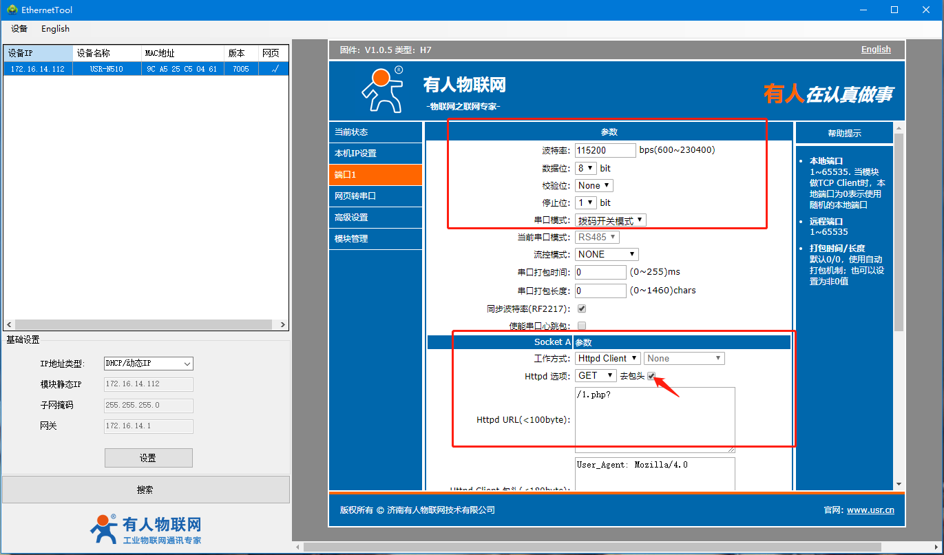 7、在端口1處,確認(rèn)當(dāng)前串口參數(shù)(默認(rèn)為115288,N,8,1)以及串口模式(網(wǎng)頁(yè)設(shè)置優(yōu)先級(jí)大于撥碼開(kāi)關(guān)),默認(rèn)為撥碼開(kāi)關(guān)模式,所以我們需要將設(shè)備的撥碼撥到相應(yīng)位置,設(shè)置模塊工作方式:HTTP client,HTTPD選項(xiàng)設(shè)置為GET,點(diǎn)擊去包頭,最后我們獲取到的數(shù)據(jù)將不會(huì)存在包頭,URL為:/1.php? 。