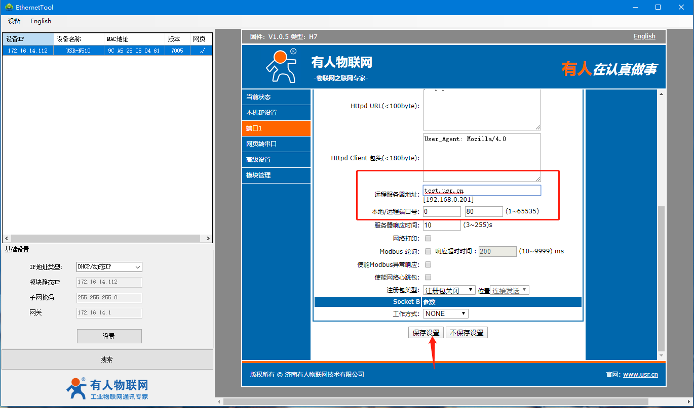 8、遠(yuǎn)程服務(wù)器地址為:test.usr.cn,遠(yuǎn)程端口為80。(這個(gè)是我司的測(cè)試服務(wù)器),參數(shù)設(shè)置無(wú)誤后點(diǎn)擊保存設(shè)置。