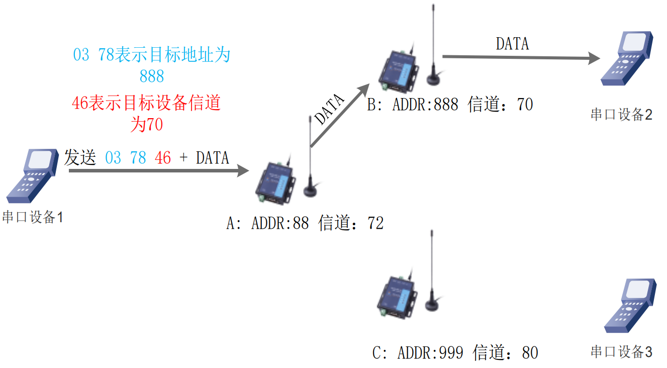 設(shè)備B:定點模式,速率8,信道70,目標地址888。