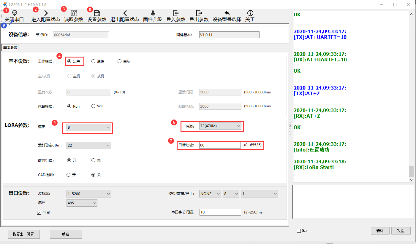 打開LoRa設(shè)置軟件→ 選擇LG206-L-P-H10 → 依次點擊打開串口(選擇A、B對應(yīng)的串口號,串口參數(shù):115200,None,8,1,NFC) → 進入配置狀態(tài) → 讀取參數(shù) → 配置圖中的參數(shù) → 一鍵設(shè)置所有參數(shù) → 關(guān)閉LoRa設(shè)置軟件。