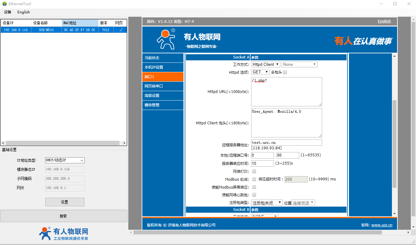 N510端口1工作方式設(shè)置HTTPD模式,GET,遠(yuǎn)程服務(wù)器地址填test.usr.cn,遠(yuǎn)程端口填80,本地端口號(hào)設(shè)置為0。URL填/1.php?,不濾除報(bào)頭。
