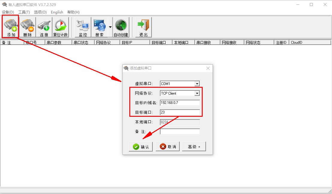 電腦下載的虛擬串口軟件,添加一個(gè)虛擬串口COM1。遠(yuǎn)程IP填N510的IP,遠(yuǎn)程端口填N510的端口23。