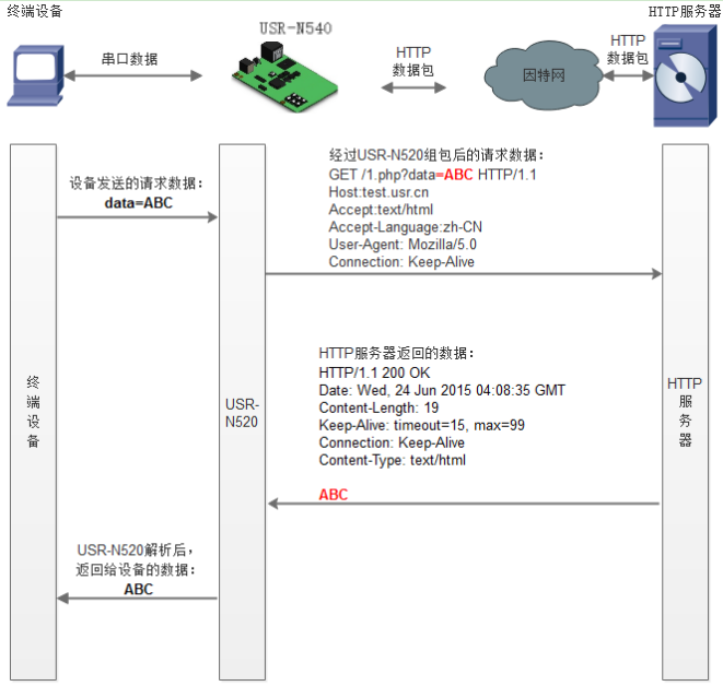 N540端口1工作方式設置HTTPD模式,GET,遠程服務器地址填test.usr.cn,遠程端口填80,本地端口號設置為0。URL填/1.php?,不濾除報頭。