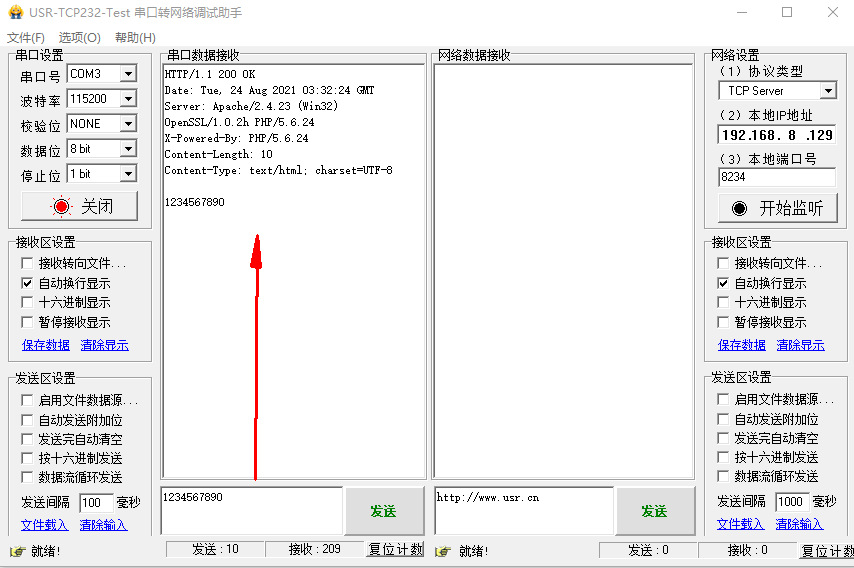 打開串口網(wǎng)絡(luò)助手,串口參數(shù)和N540 端口1參數(shù)保持一致,串口發(fā)送數(shù)據(jù)1234567890,測(cè)試服務(wù)器返回?cái)?shù)據(jù)。
