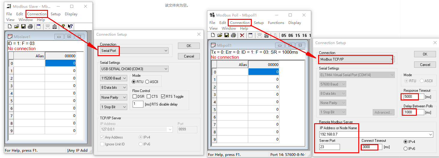 模擬測(cè)試用MODBUS SLAVE軟件做串口設(shè)備,用MODBUS POLL軟件做網(wǎng)絡(luò)端。