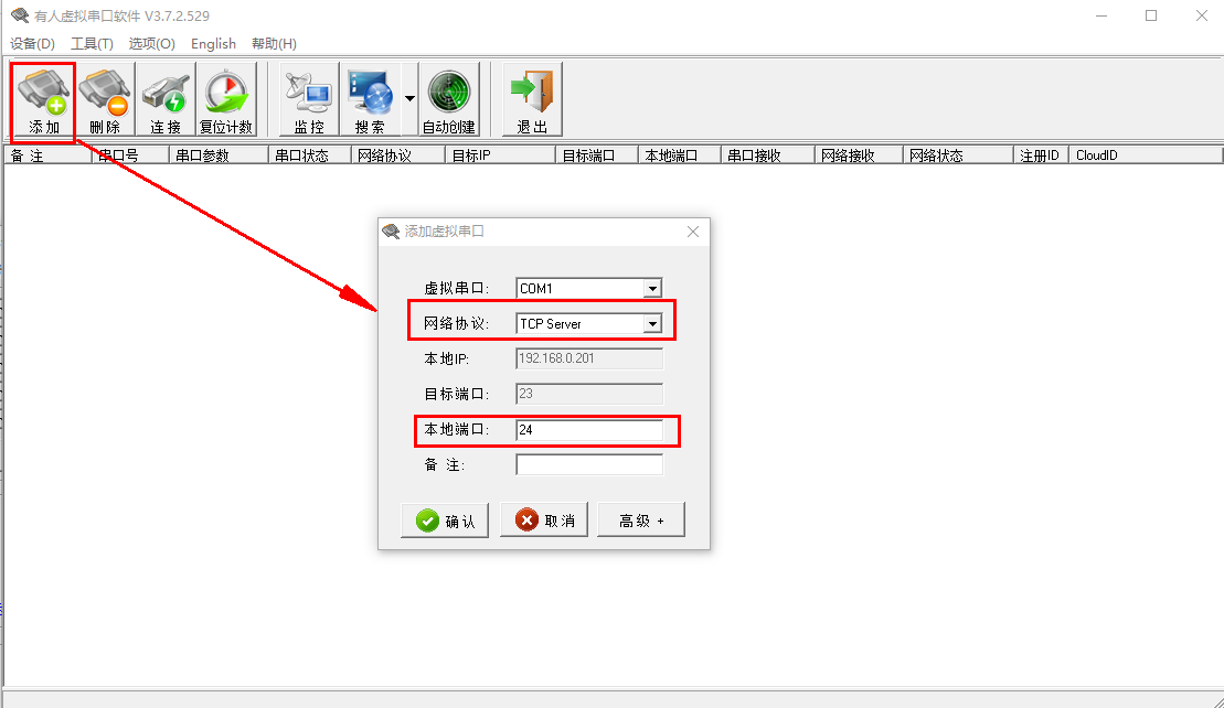 電腦下載的虛擬串口軟件,添加一個虛擬串口COM1。做TCP server,本地端口填24。