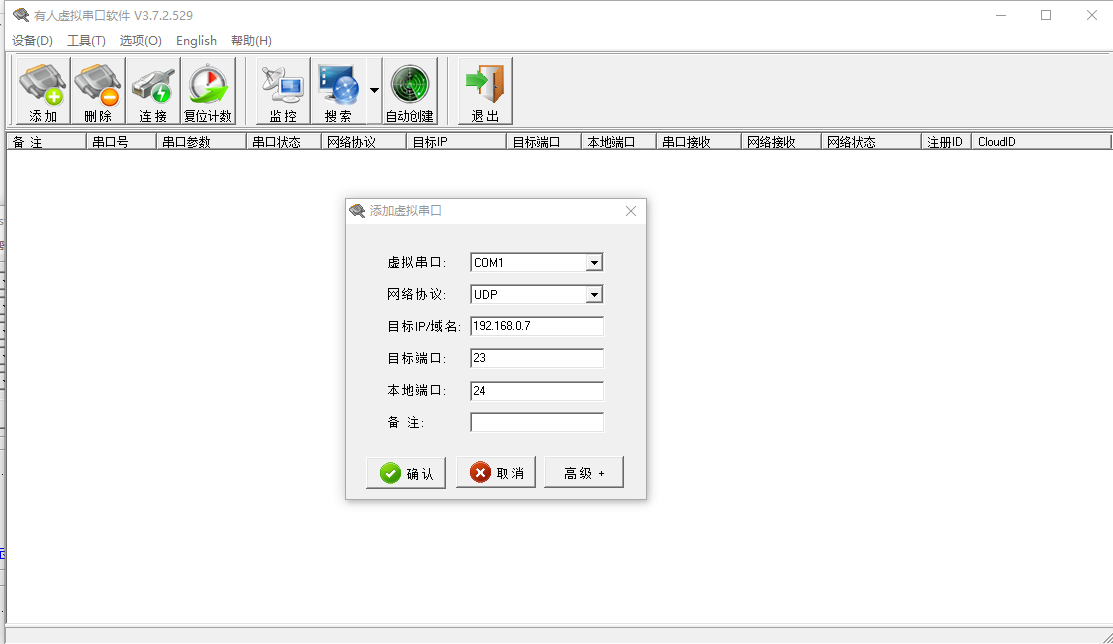 電腦下載的虛擬串口軟件,添加一個虛擬串口COM1。目標IP填N540的IP,目標端口填N540的端口23。本地端口號填24。