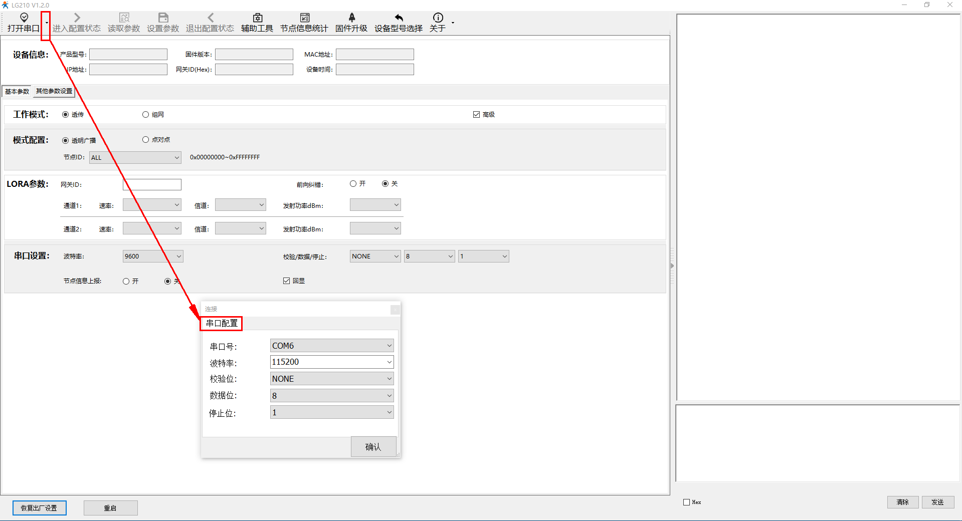 設(shè)置串口配置,選擇USB-RS232串口線的COM口號,USR-LG210默認串口參數(shù)是115200,NONE,8,1。