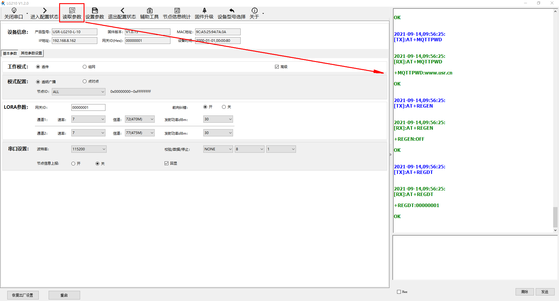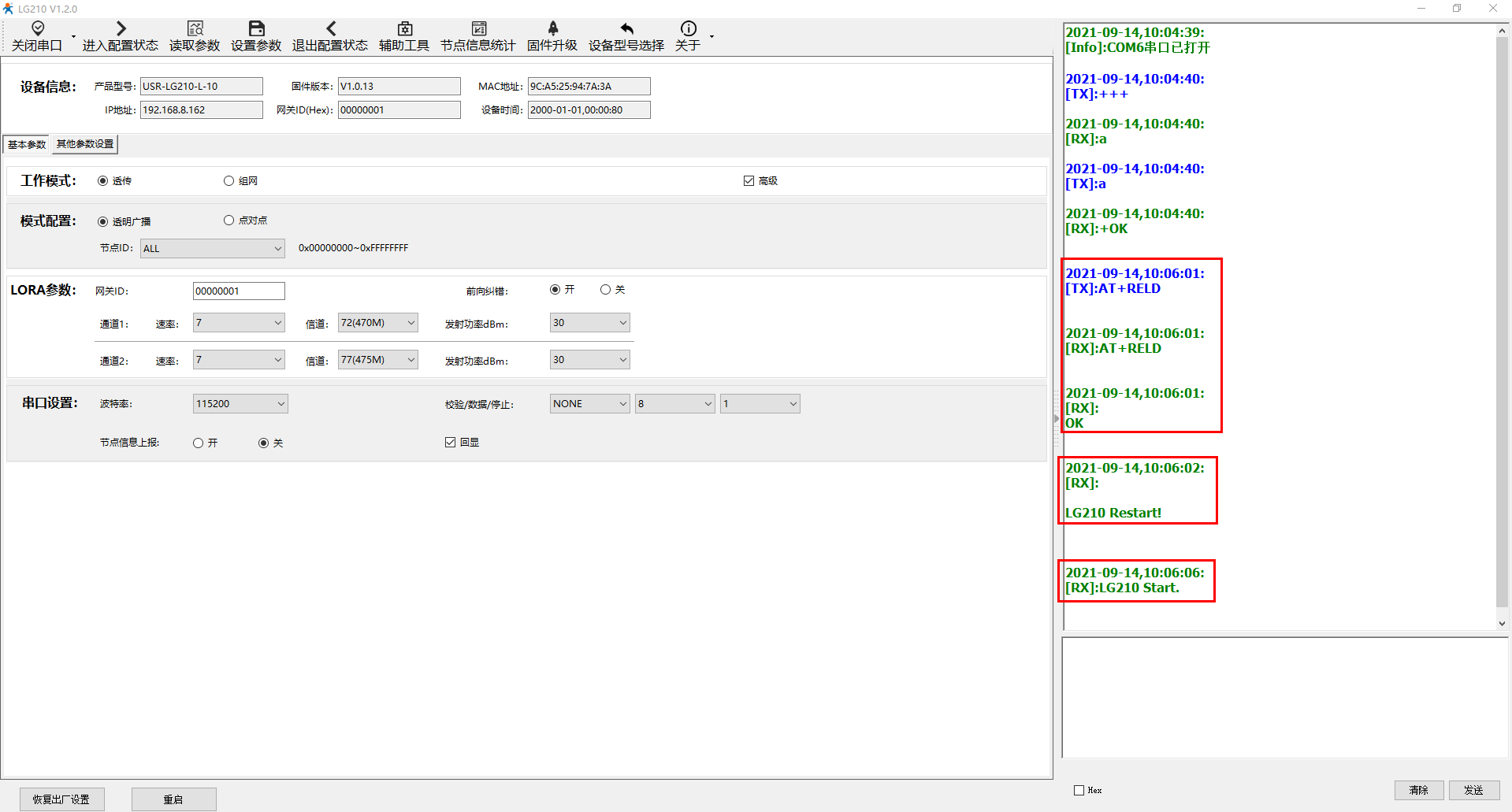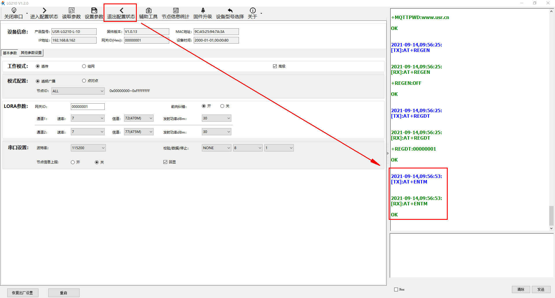 打開串口,點擊進入配置狀態(tài),返回+++a,a+Ok,接著讀取參數(shù),可以正常讀取參數(shù)后,點擊退出配置狀態(tài)。