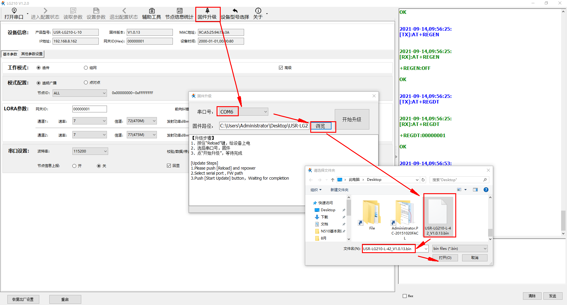 將USR-LG210要升級的固件bin文件放在桌面,舉例,固件名是USR-LG210-L-42_V1.0.13.bin。