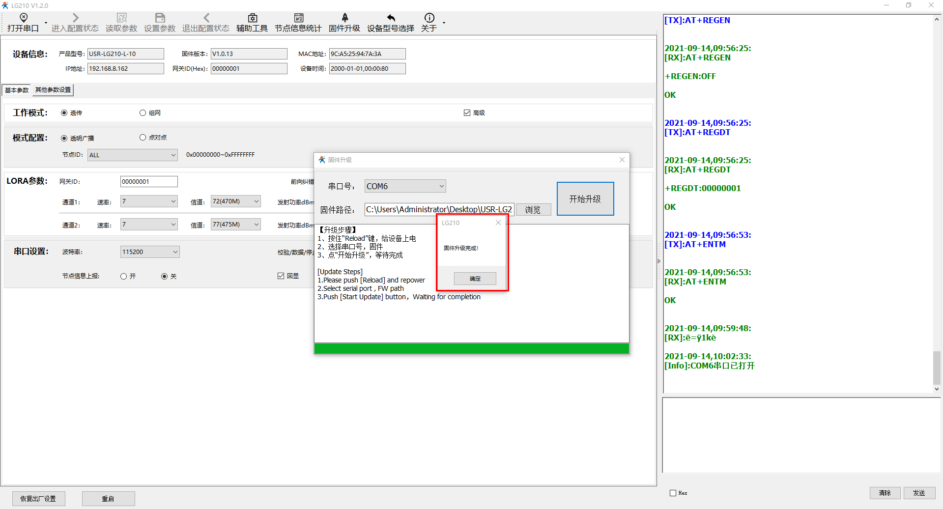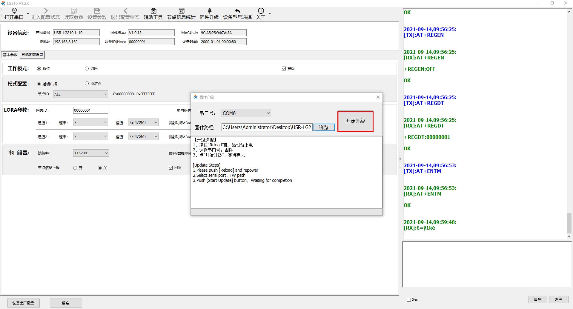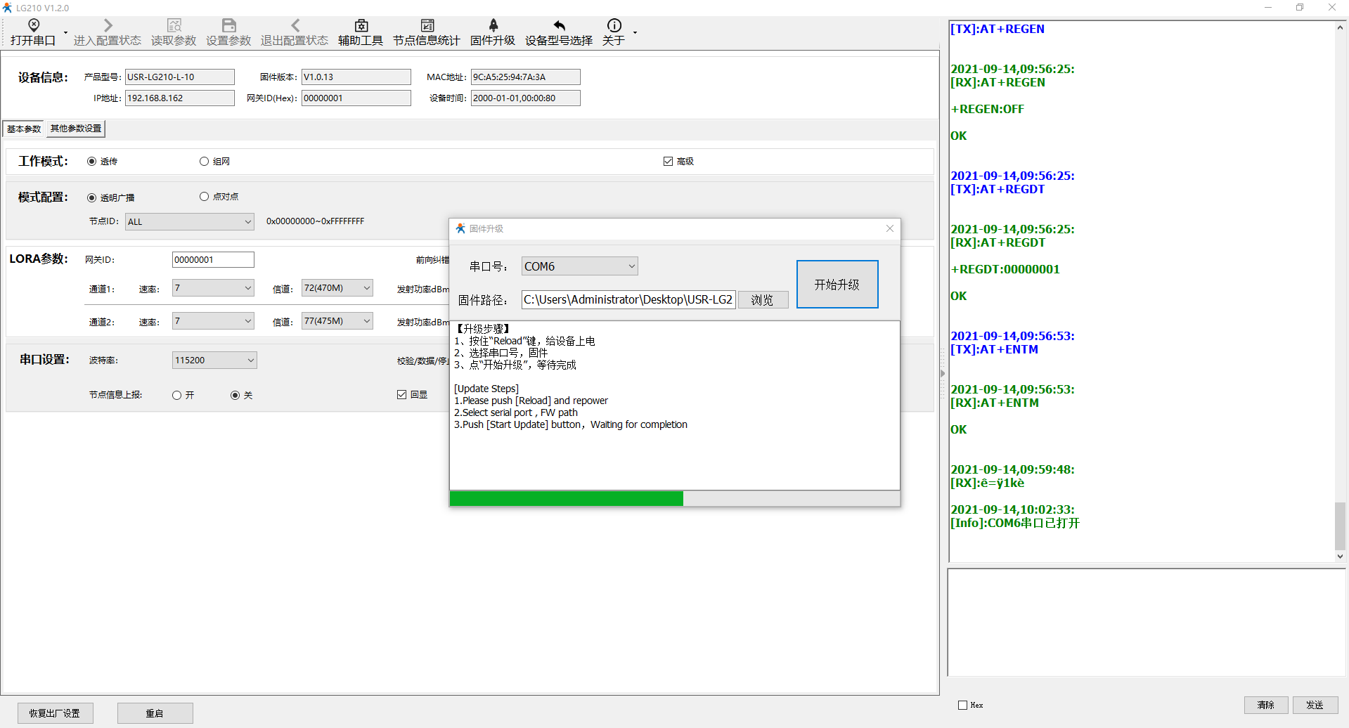 驗證USB-RS232串口線通訊正常,接著就可以對USR-LG210-L進行固件升級。