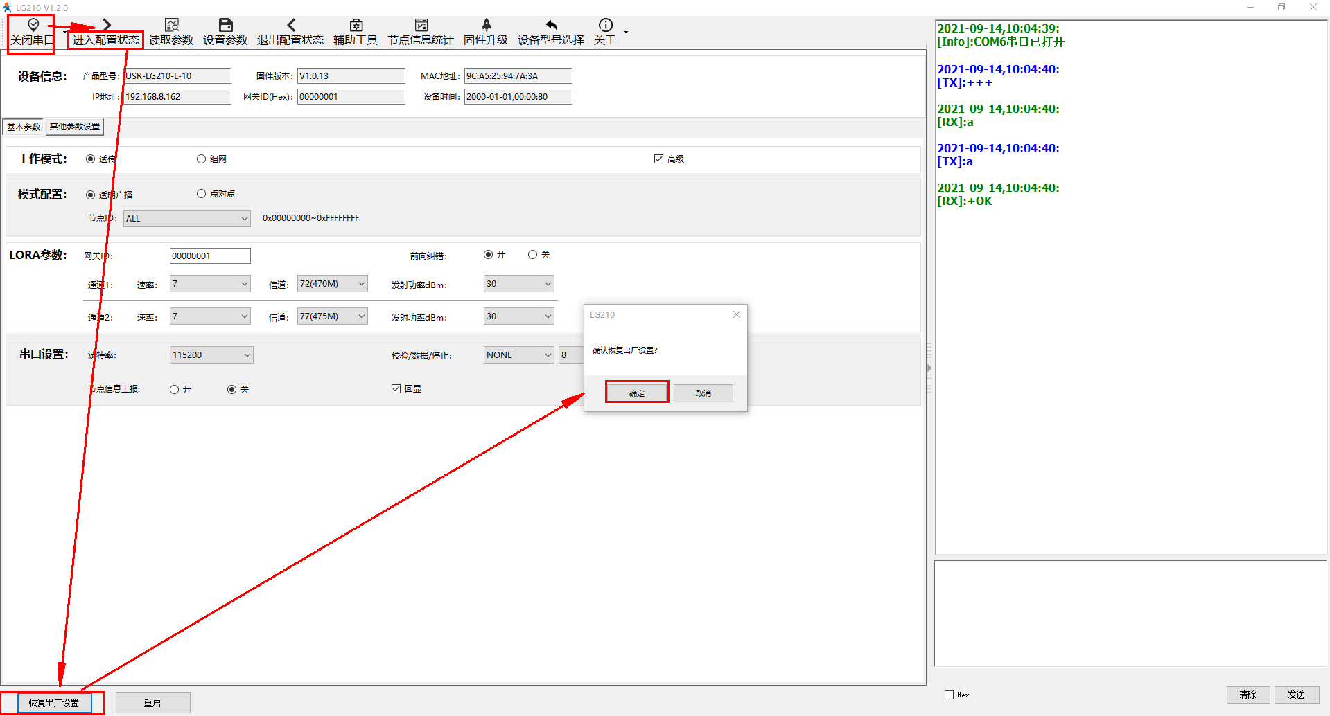 升級完成,USR-LG210-L使用設(shè)置軟件,打開串口,點擊進入配置狀態(tài),點擊恢復(fù)出廠值。進行恢復(fù)出廠值設(shè)置,恢復(fù)出廠值成功后,可以對USR-LG210-L進行參數(shù)設(shè)置。
