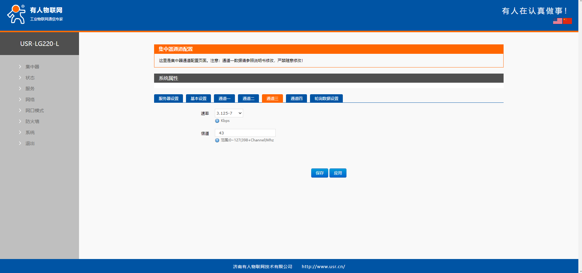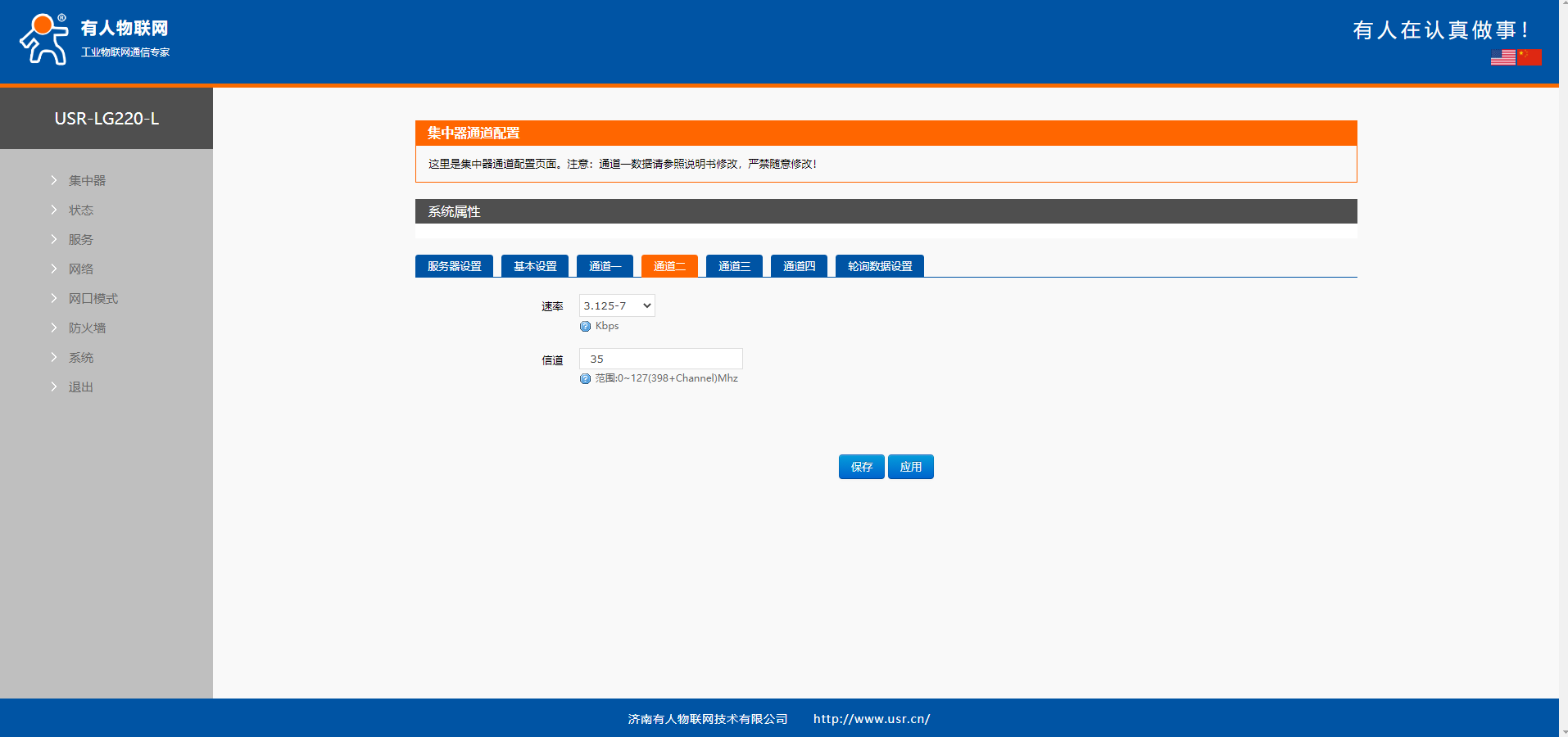 3、修改USR-IO34-LR-C的空中速率等級,設(shè)置為7。信道設(shè)置為35,和USR-LG220-L的通道一速率、信道保持一致。