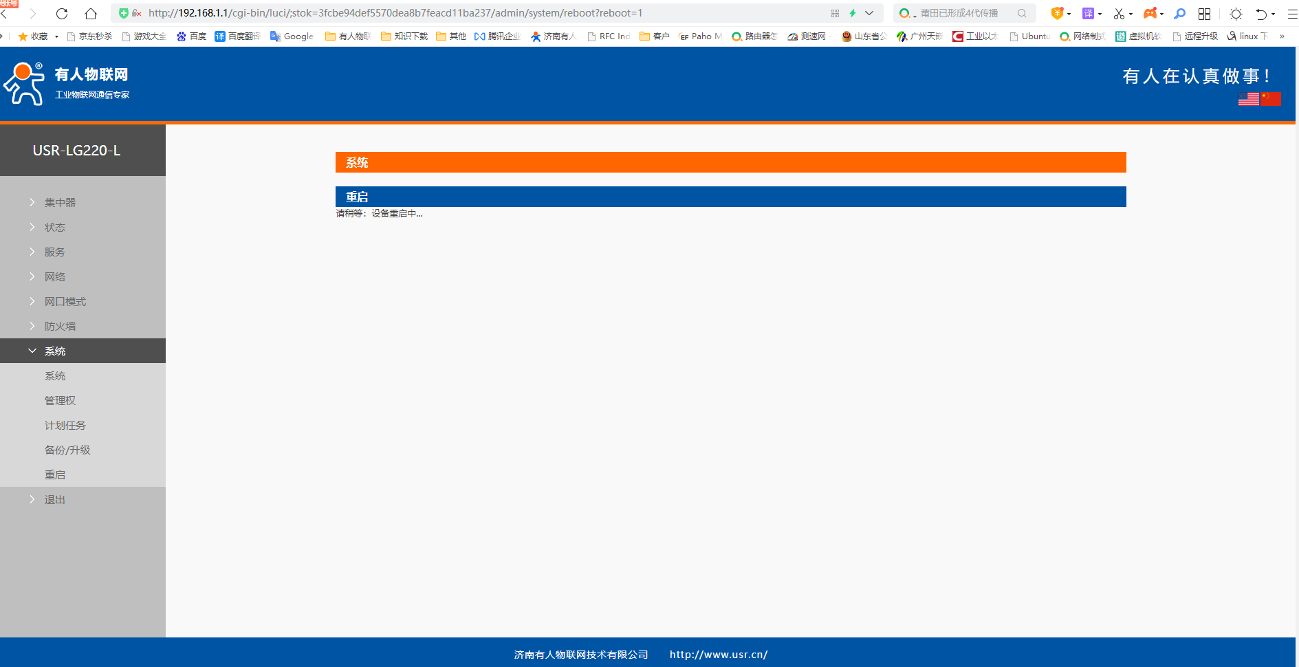 4、USR-LG220-L網(wǎng)頁系統(tǒng),點(diǎn)擊重啟,執(zhí)行重啟。等待一段時(shí)間,等待USR-LG220-L重啟完畢。