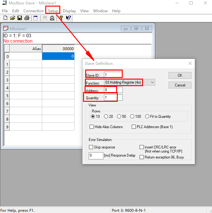 點(diǎn)擊Setup,設(shè)置從機(jī)地址,Slave ID 設(shè)置485從機(jī)地址1,F(xiàn)unction用03功能碼,Address是寄存器起始地址用0,Quantity設(shè)置從寄存器起始開始的寄存器數(shù)量,用1。