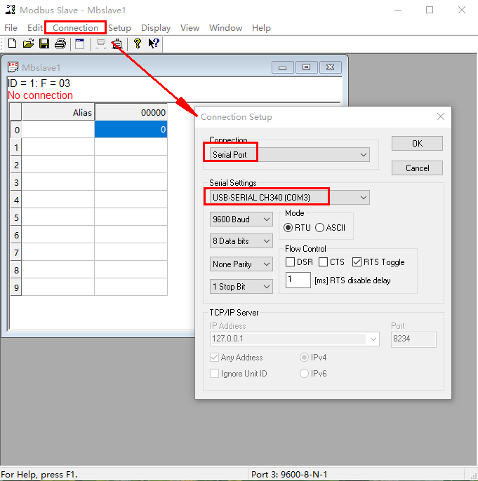 1、USR-IO34-LR-C 使用USB-RS485接電腦,電腦安裝并打開MODBUS SLAVE軟件,模擬MODBUS RTU 485串口設(shè)備。