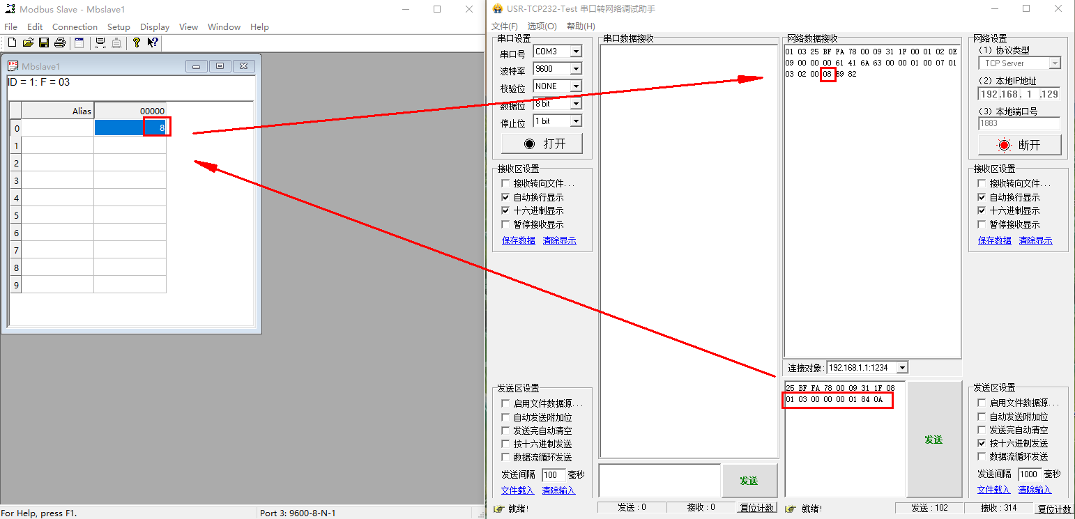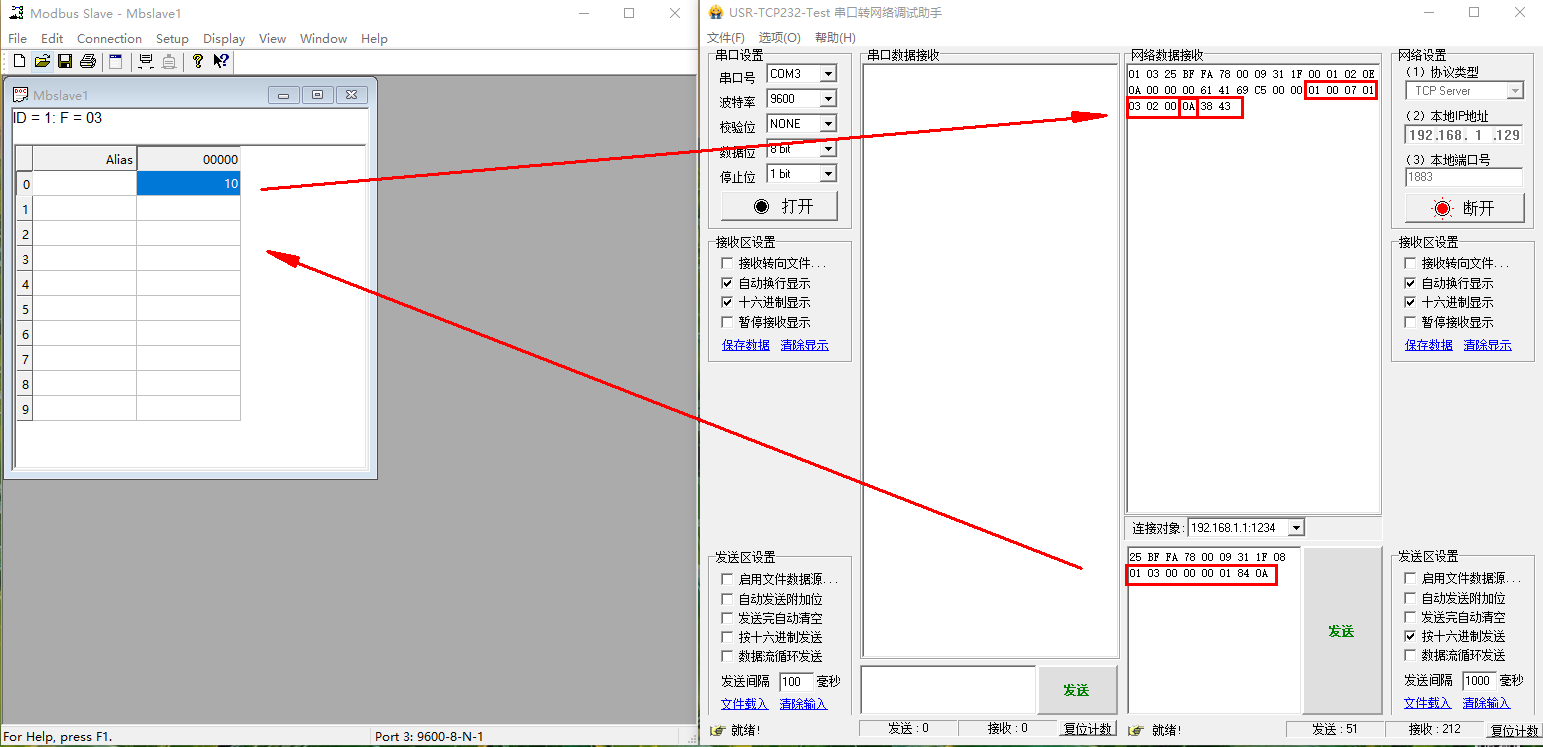 網(wǎng)絡(luò)端發(fā)送和接收都勾選十六進(jìn)制顯示和接收,然后網(wǎng)絡(luò)端按照USR-LG220-L的服務(wù)器主動下發(fā)協(xié)議,輸入命令,去讀取USR-IO34-LR-C 接的485從機(jī)地址1,寄存器地址0的數(shù)據(jù)。