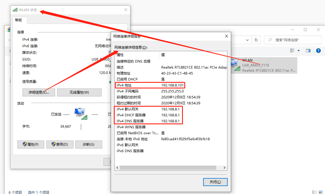 雙擊該網(wǎng)卡,顯示詳細(xì)信息,查看電腦獲取的IP