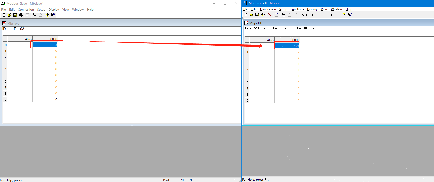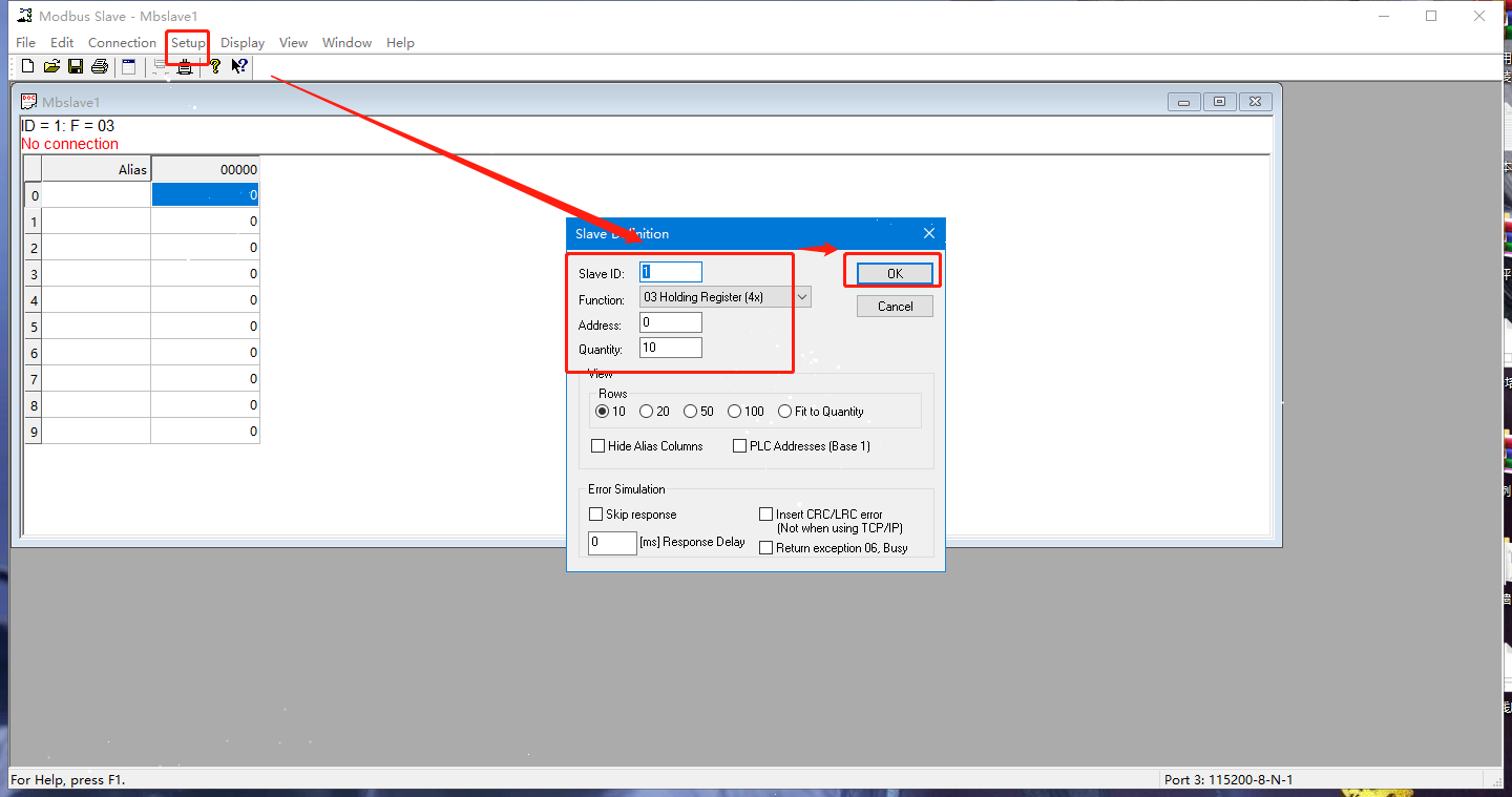 2. 打開MODBUS SLAVE軟件模擬從機,以相同的串口參數(shù)打開N580的串口。