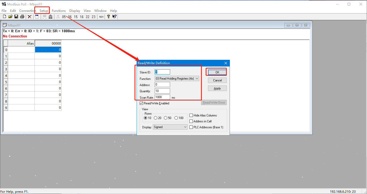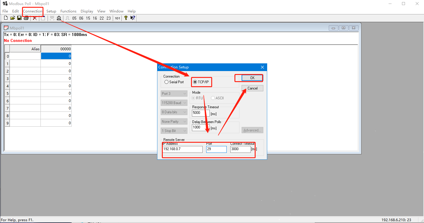 3. 打開MODBUS POLL軟件模擬主機 連接N580的IP和端口 ,與其建立TCP連接。