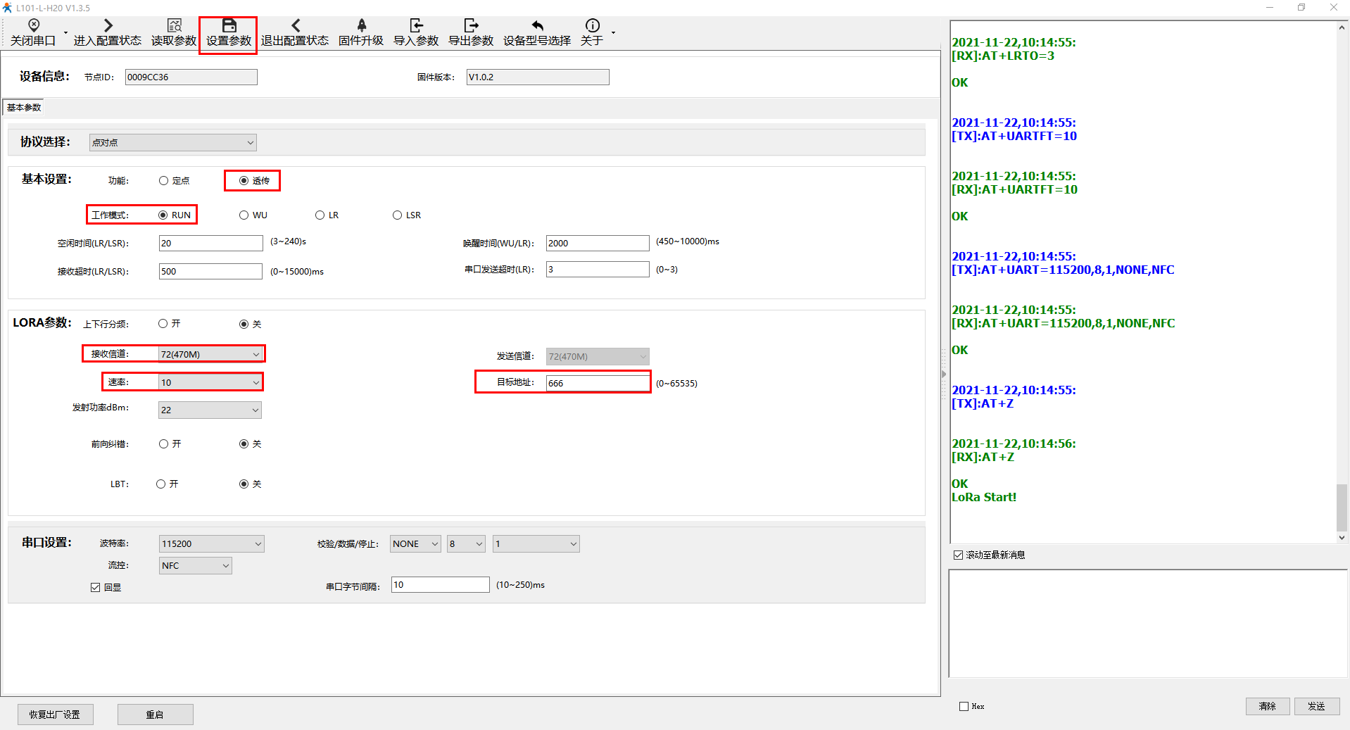 上電第一次,用默認(rèn)串口參數(shù)打開串口COM4,點(diǎn)擊進(jìn)入配置狀態(tài),讀取參數(shù)。然后設(shè)置透傳功能,信道72,速率10,目標(biāo)地址666。最后點(diǎn)擊設(shè)置參數(shù)。