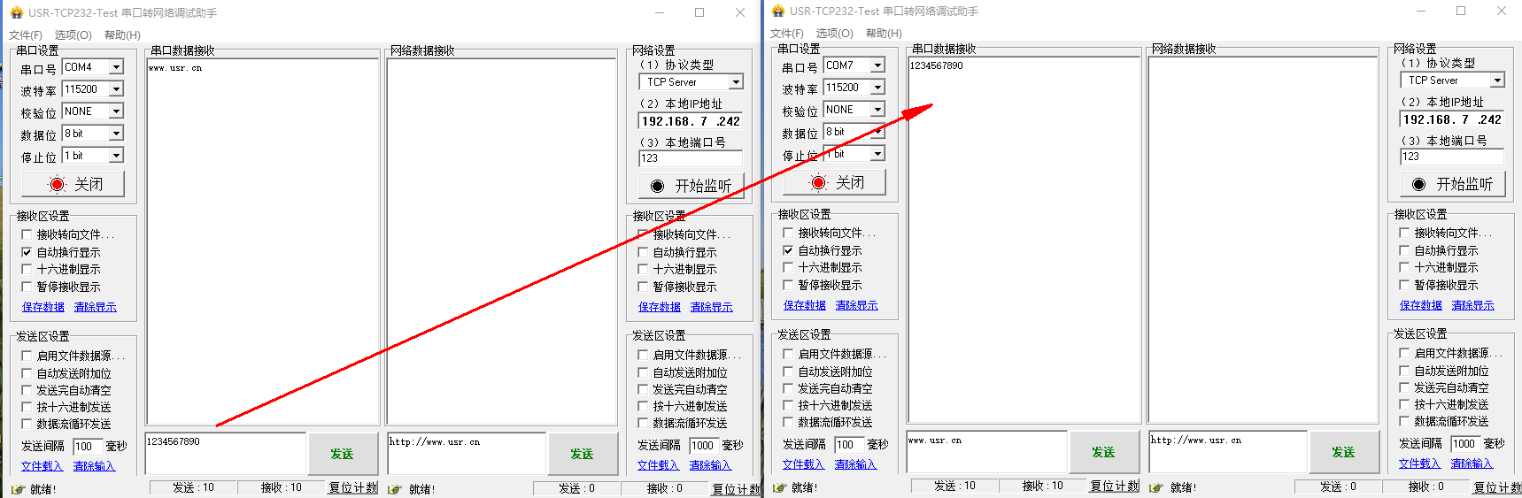 電腦打開2個USR-TCP232-TEST串口軟件,打開對應(yīng)2個WH-L101-L-H20的USB-RS232串口線COM口號,一個WH-L101-L-H20發(fā)送數(shù)據(jù),另一個WH-L101-L-H20接收數(shù)據(jù)。