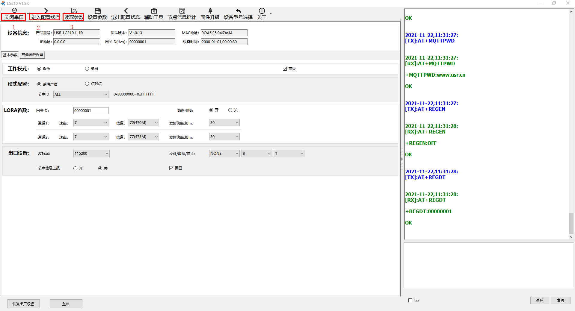 1、電腦打開(kāi)USR-LG210的設(shè)置軟件,打開(kāi)串口,點(diǎn)擊進(jìn)入配置狀態(tài),讀取參數(shù)。