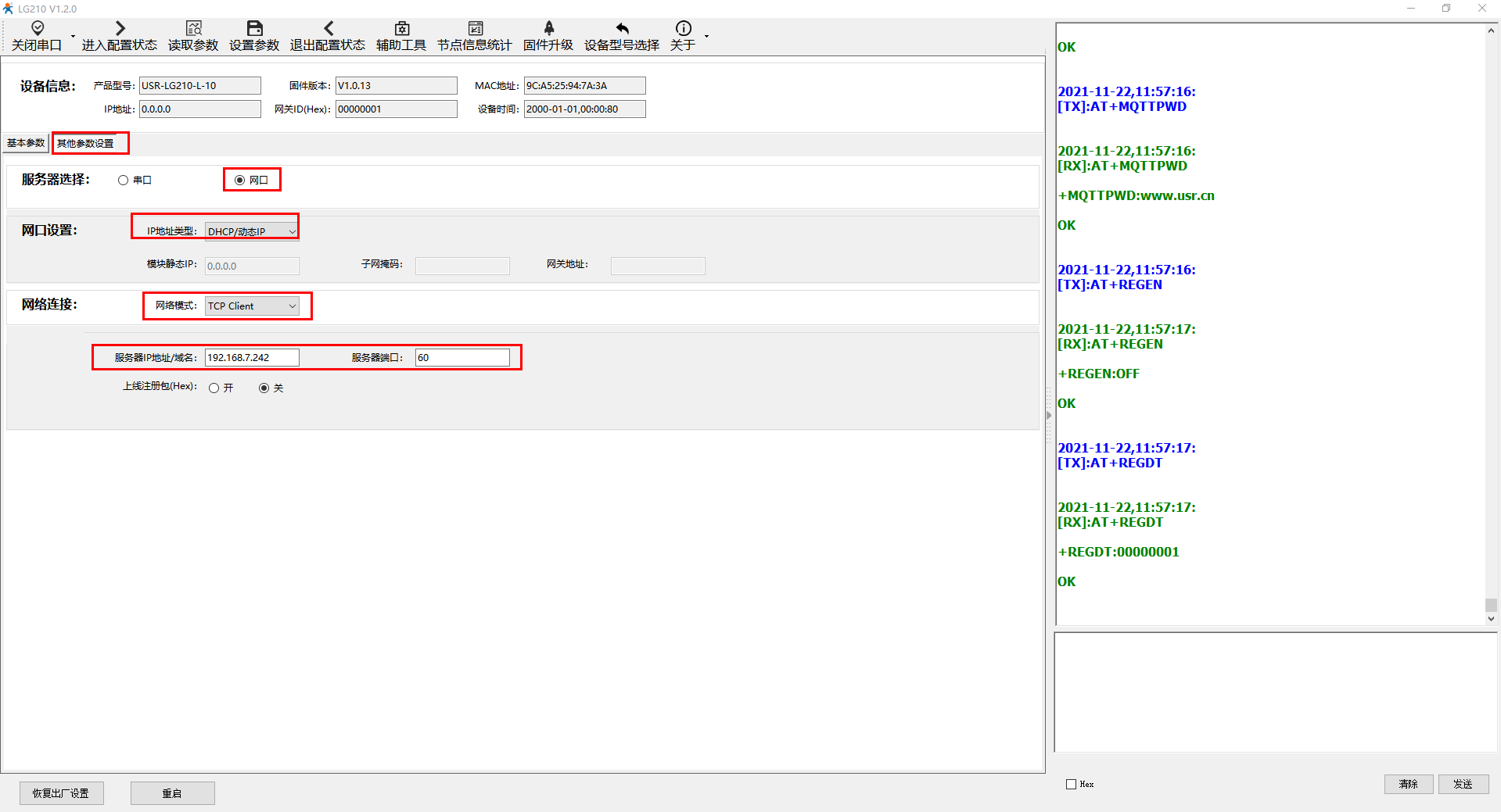 WH-L101-L-H20和USR-LG210連接TCP服務(wù)器-透?jìng)髂J酵该鲝V播示例