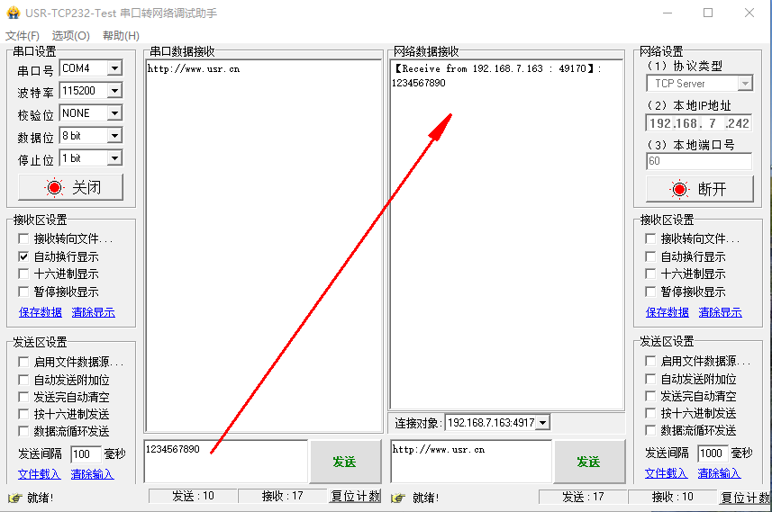 WH-L101-L-H20串口發(fā)送數(shù)據(jù),USR-LG210TCP client連接的TCP server服務(wù)器接收數(shù)據(jù)。