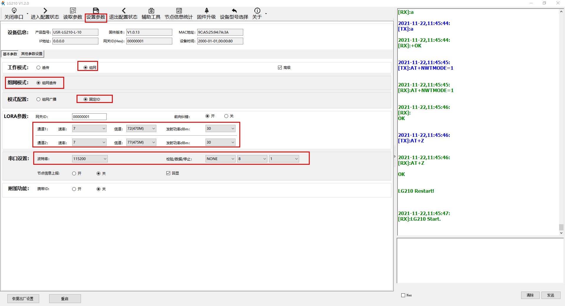電腦打開2個USR-TCP232-TEST串口軟件,打開對應(yīng)WH-L101-L-H20和USR-LG210的USB-RS232串口線COM口號,USR-LG210串口發(fā)送十六進制數(shù)據(jù),數(shù)據(jù)前面帶節(jié)點ID,WH-L101-L-H20串口接收十六進制數(shù)據(jù)。這樣USR-LG210可以指定向WH-L101-L-H20發(fā)送數(shù)據(jù)。