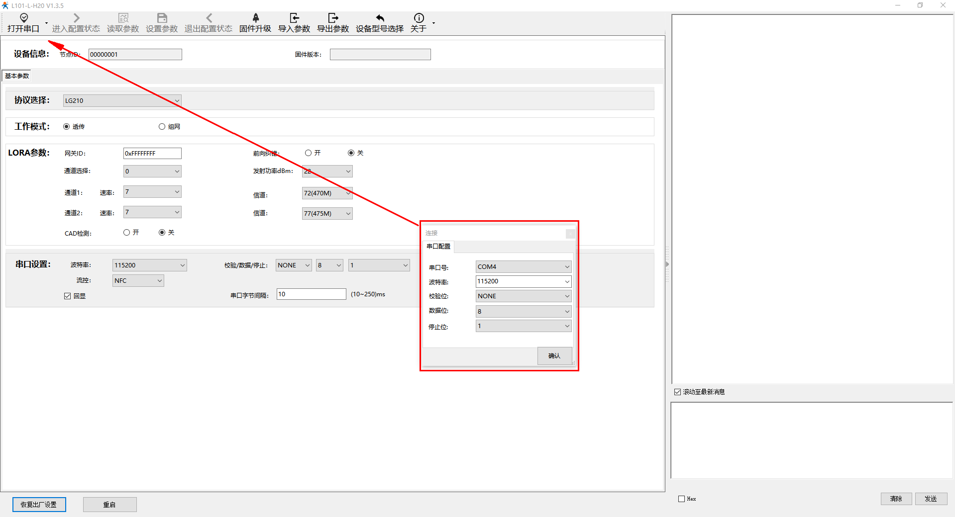 2、用默認串口參數(shù)打開串口COM4,點擊進入配置狀態(tài),讀取參數(shù)。
