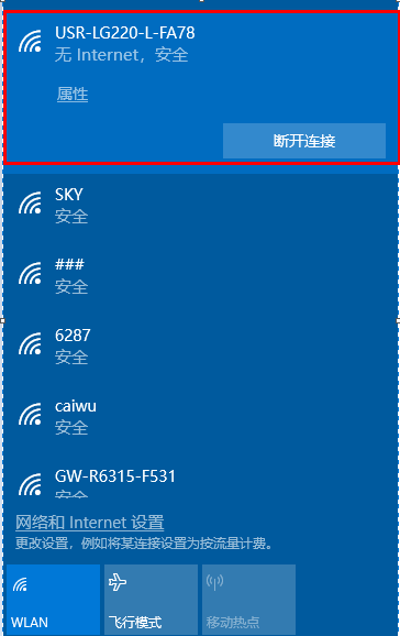 電腦無線網(wǎng)卡搜索并連接USR-LG220的WiFi,WiFi密碼是www.lifj.com.cn。其他網(wǎng)卡禁用,打開控制面板,