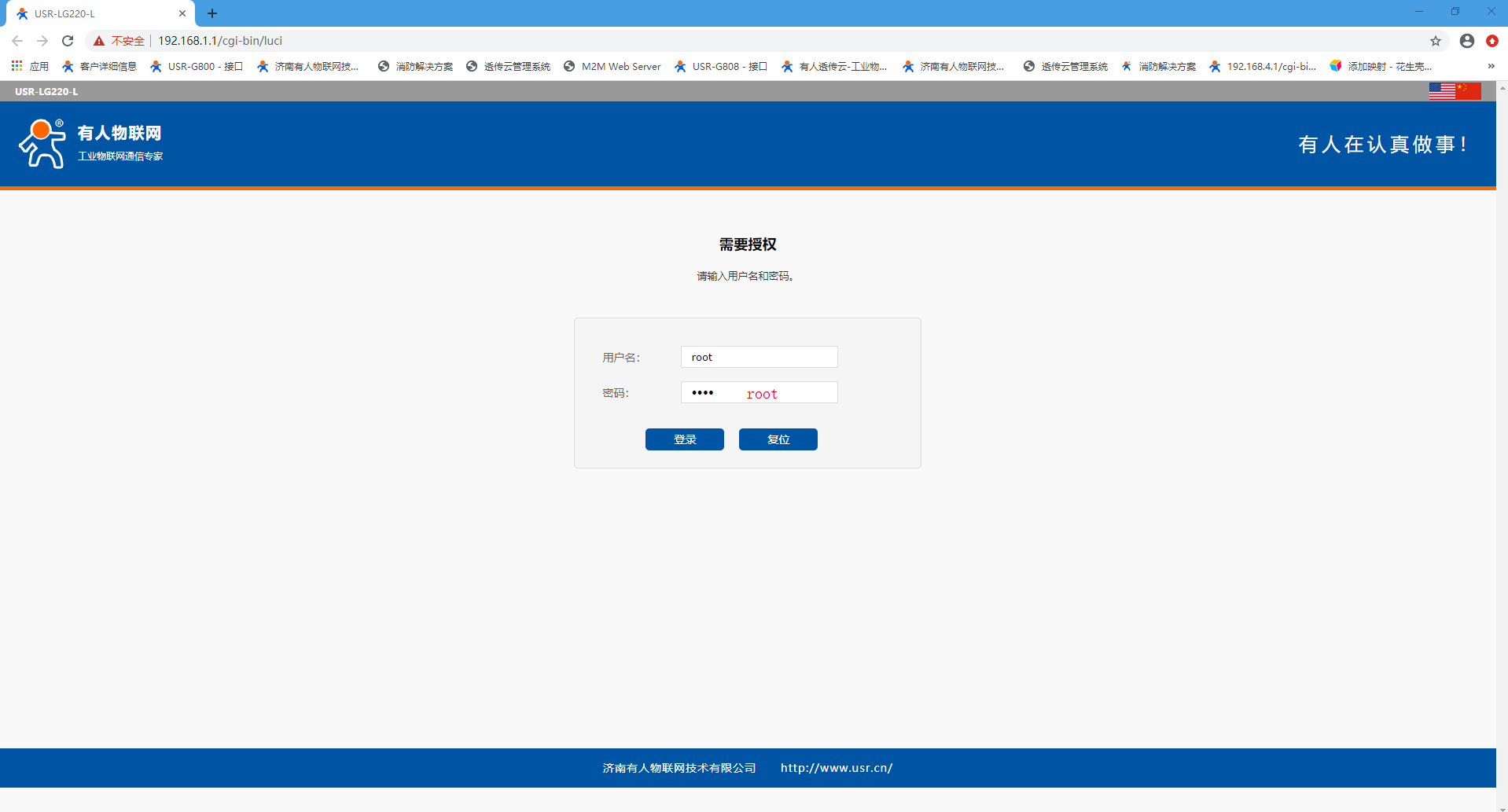 瀏覽器輸入USR-LG220默認(rèn)IP,192.168.1.1,密碼是root ,登錄USR-LG220內(nèi)置網(wǎng)頁。