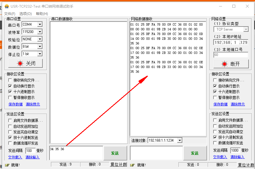 電腦打開1個USR-TCP232-TEST串口軟件,勾選十六進(jìn)制顯示和按十六進(jìn)制發(fā)送。