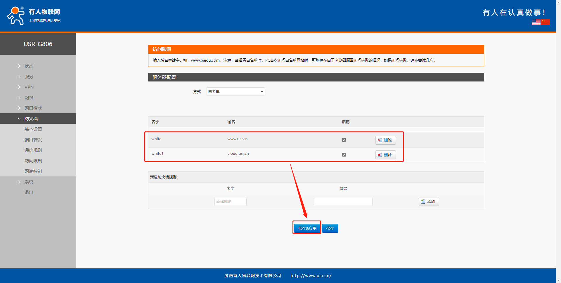 2設(shè)置域名白名單,注意:最后一定要“保存&應(yīng)用”,參數(shù)才會生效