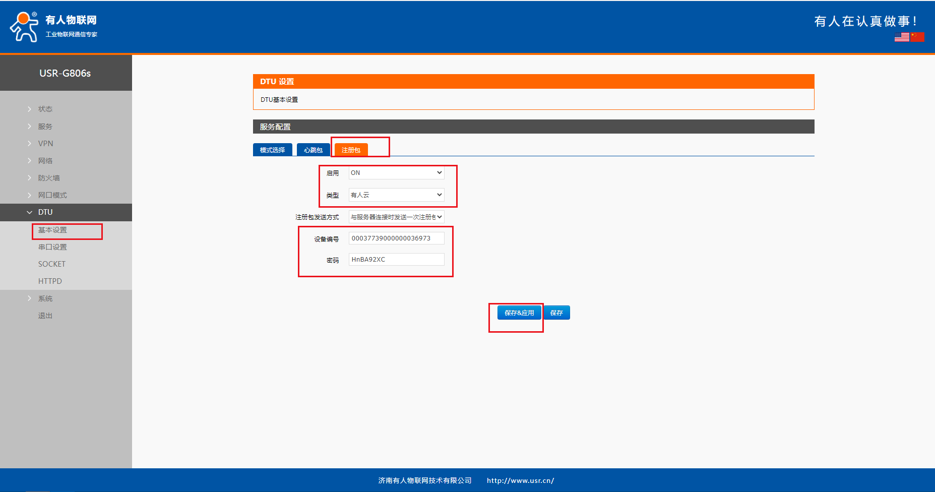 在DTU---基本設(shè)置---心注冊(cè)包,注冊(cè)包類型選擇有人云,設(shè)備編號(hào)和密碼填寫云端自動(dòng)分配的。