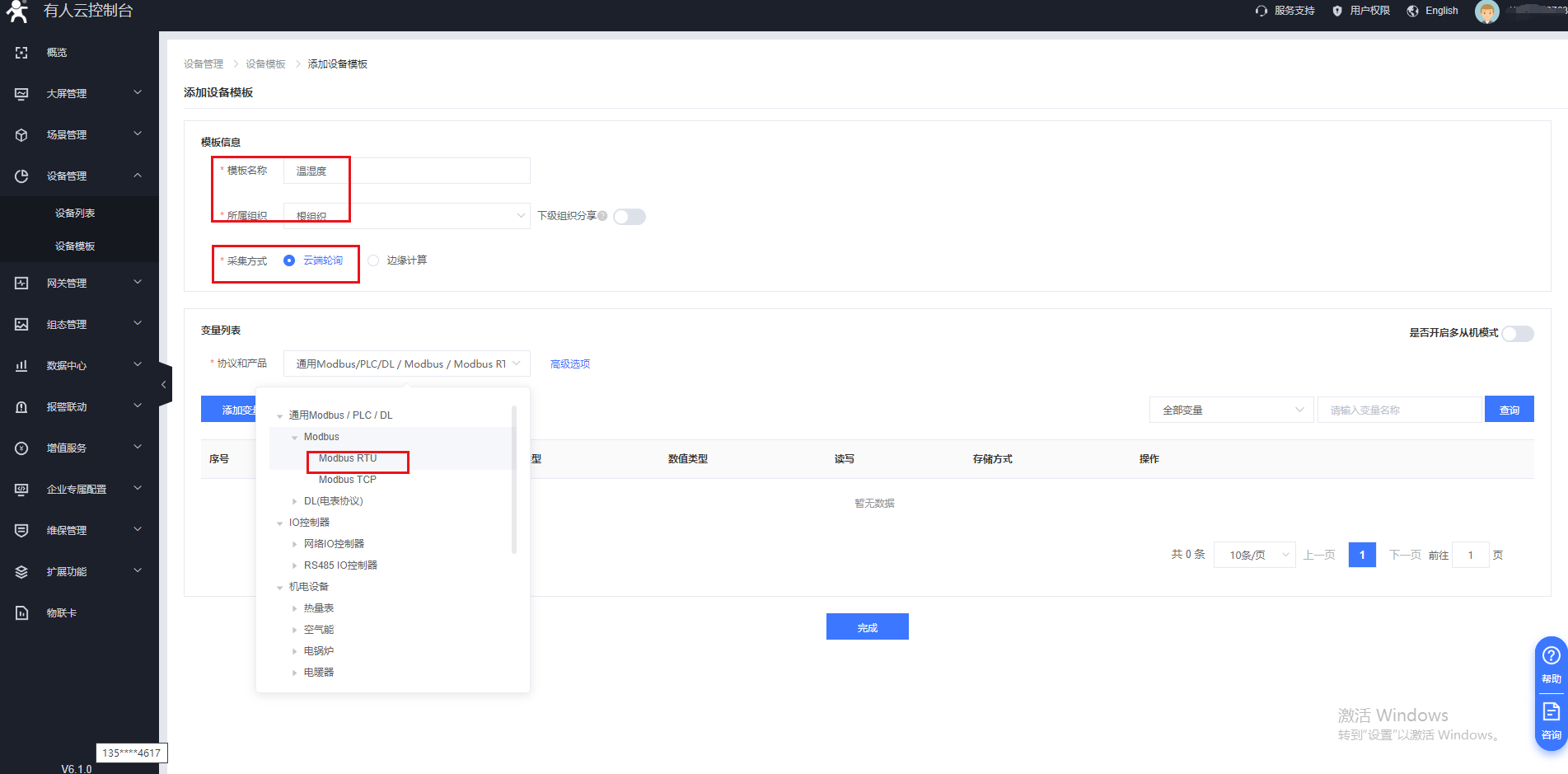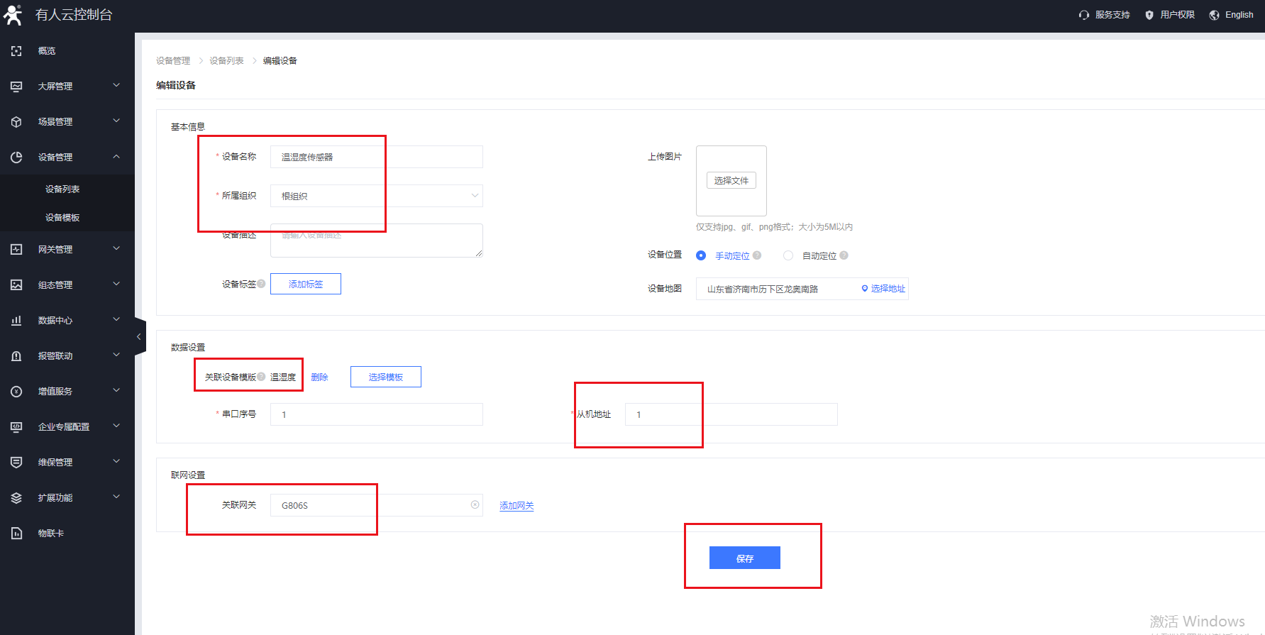 7、在設(shè)備管理--設(shè)備列表的界面添加一個(gè)設(shè)備,把設(shè)備模板和網(wǎng)關(guān)進(jìn)行關(guān)聯(lián),并配置串口終端設(shè)備的從機(jī)地址。(測(cè)試從機(jī)地址設(shè)置為1)