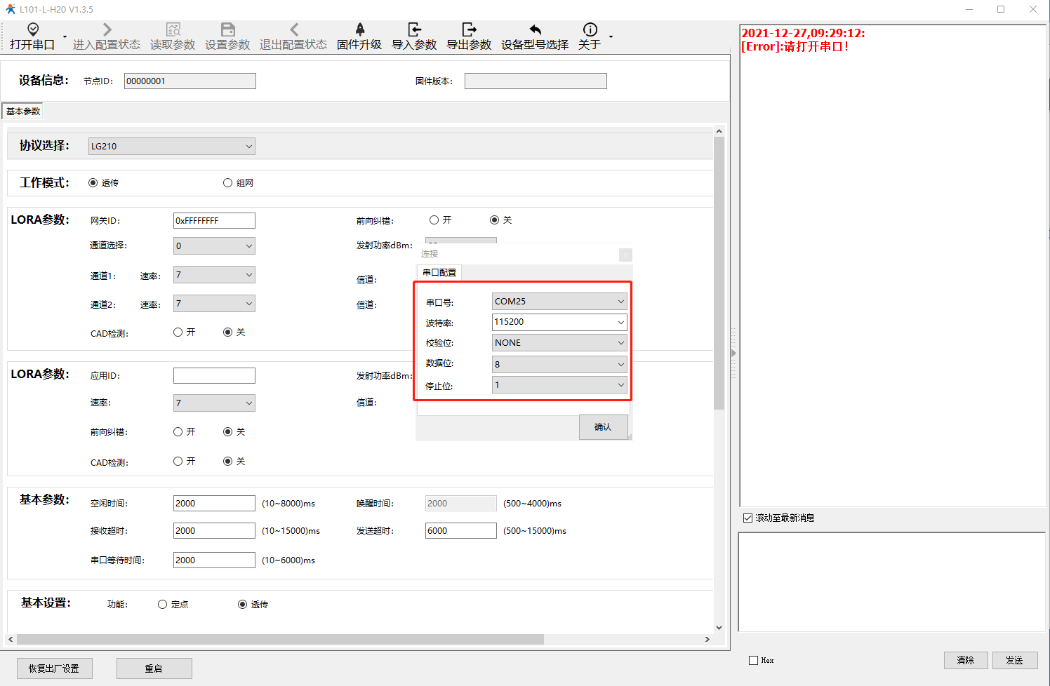 2、選擇A模塊串口,默認串口參數(shù)波特率115200、無數(shù)據(jù)位、數(shù)據(jù)位8、停止位1,點擊確認。