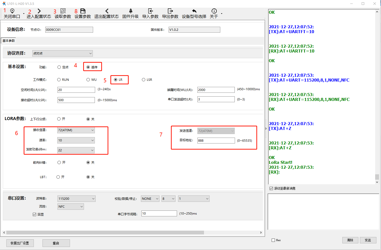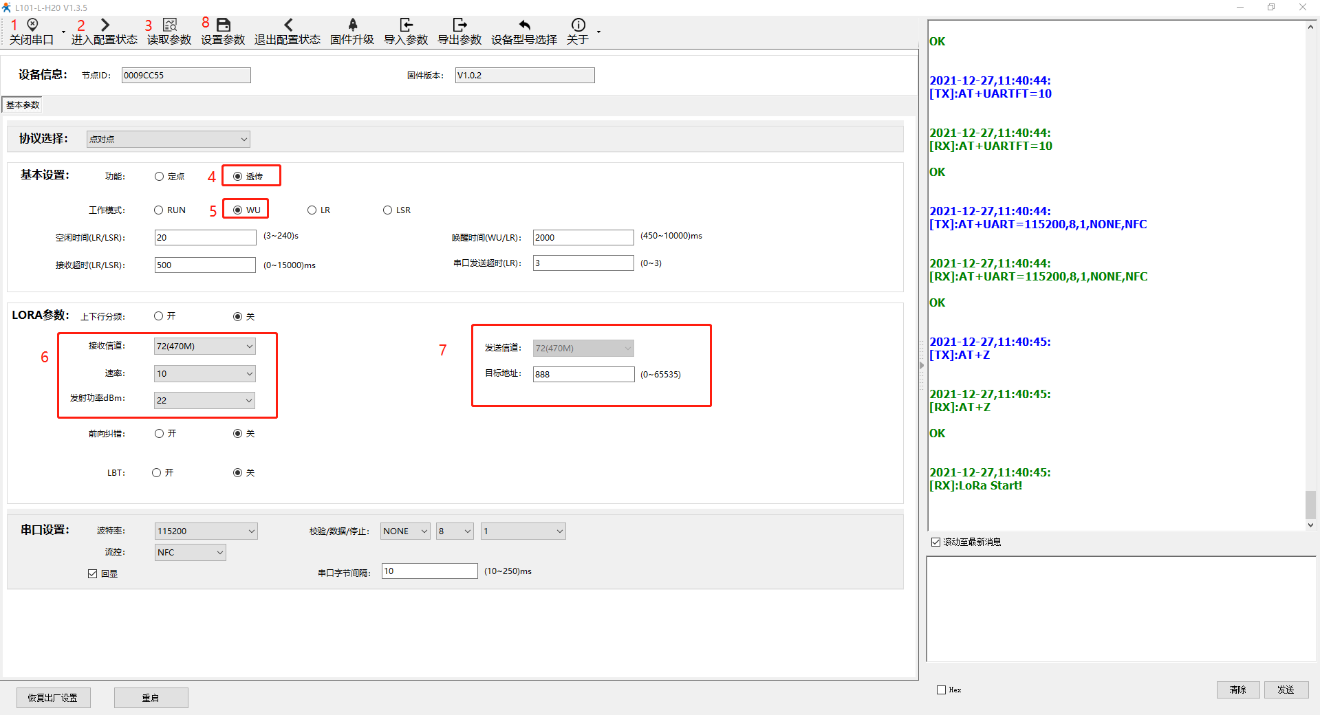 6、點擊“打開串口”,點擊“進入配置狀態(tài)”,返回+ok后點擊“讀取參數(shù)”。然后設置透傳功能,LR模式,信道72,速率10,目標地址888。最后點擊“設置參數(shù)”。