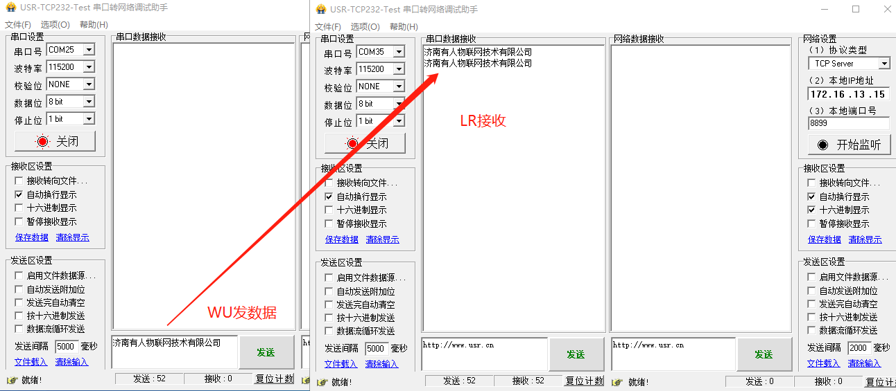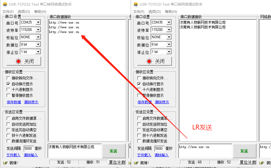 啟動兩個USR-TCP232-Test分別連接LoRa數(shù)傳終端A(com25)、B(com35),使用WU設備發(fā)送數(shù)據(jù)LR設備可接收數(shù)據(jù),通信效果如下圖所示: