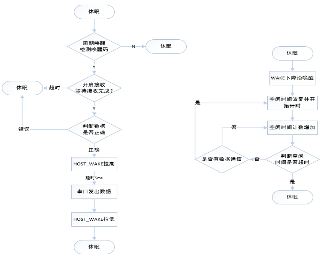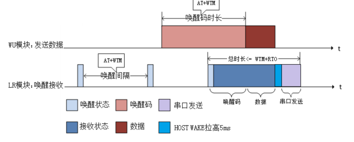 LR 低功耗接收模式,上電后如果無線和串口持續(xù)一定時間無數(shù)據(jù)通信則模塊進入休眠,休眠后模塊 定期(AT+WTM 設置喚醒間隔)喚醒來檢測喚醒碼,如果檢測到喚醒碼模塊立即進入接收狀態(tài),等待接收 完成,接收完成后 HOST_WAKE 引腳會在串口發(fā)送數(shù)據(jù)前拉高 5ms,數(shù)據(jù)發(fā)送完成拉低(客戶可使用 HOST_WAKE 引腳喚醒自己的 MCU),若只檢測到喚醒碼未接收到數(shù)據(jù),則等待超時后進入休眠狀態(tài)。 休眠后也可以通過 WAKE 引腳下降沿中斷來喚醒模塊,喚醒后的模塊恢復運行模式,當空閑時間大于 設定時間時模塊再次進入休眠狀態(tài)。