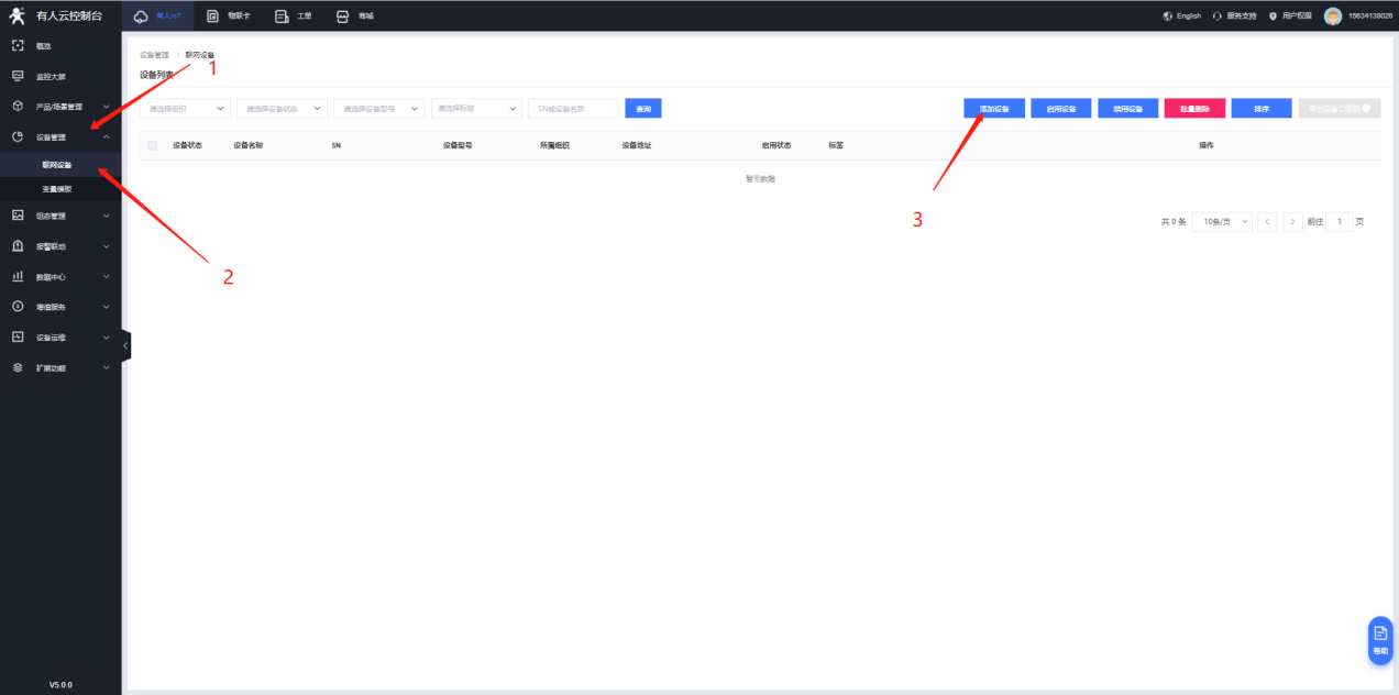 2. 點擊設備管理->聯(lián)網(wǎng)設備->添加設備