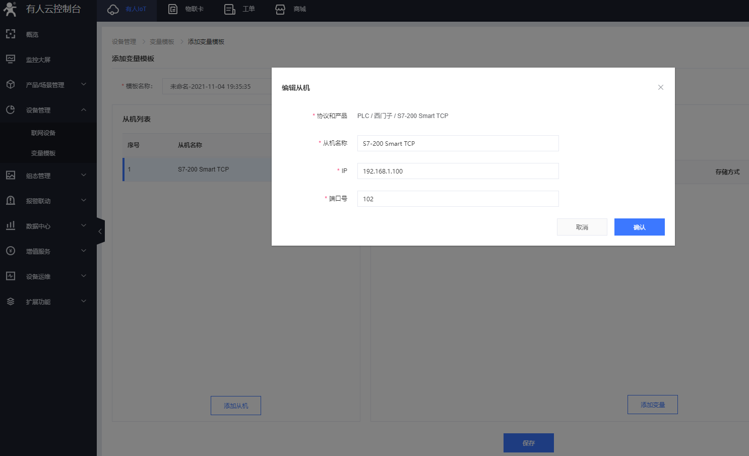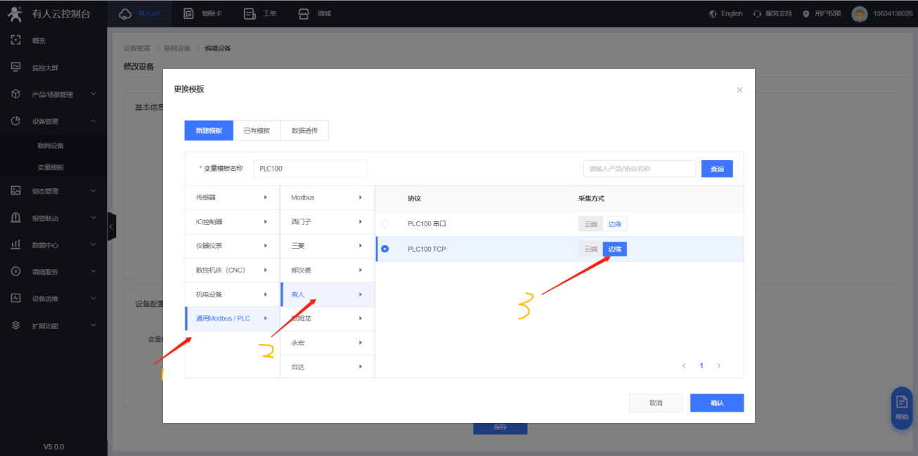 4.變量模板選擇選擇modbus/PLC->有人->PLC100 TCP,采集方式為邊緣采集